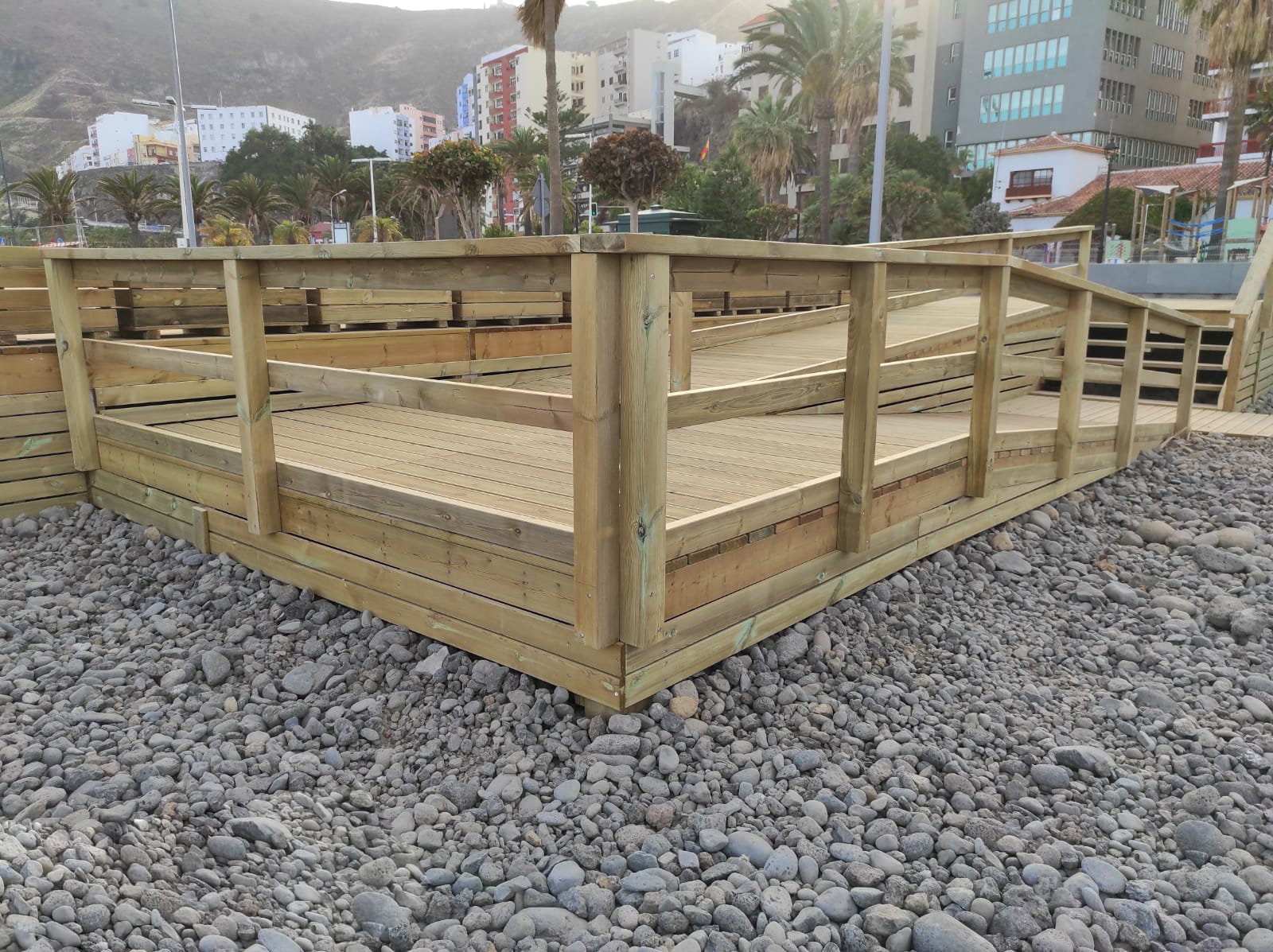 De forma sencilla se ha realizado una ampliación del paseo marítimo con una estrutura desmontable, sin apenas obra, y que lleva incluso escalera y rampas de acceso adaptados a la zona de playa y del aseo que da servicio a esta zona de ocio, que muy pronto estará disponible como nuevo equipamiento de diversión en la ciudad.